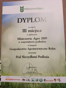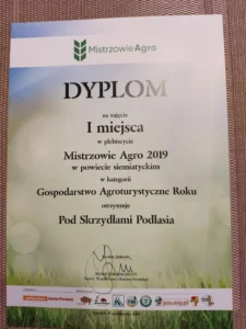 dyplom za I miejsce wśród obiektów agroturystycznych w powiecie siemiatyckim